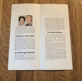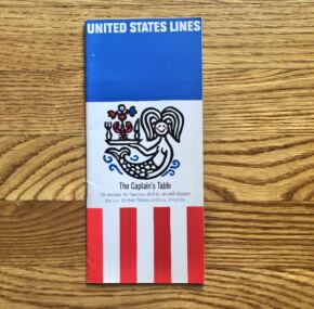 The United States Lines was keen to showcase the food, service, and clientele of our beloved Big U. Favorite dishes are endorsed by the ship’s most-famous passengers, including the Duke and Duchess of Windsor. As the booklet states: “The Windsor’s “preferred simple food ourselves.” Sure they did! Runs 16 pages with recipes for some of the meals served on board.