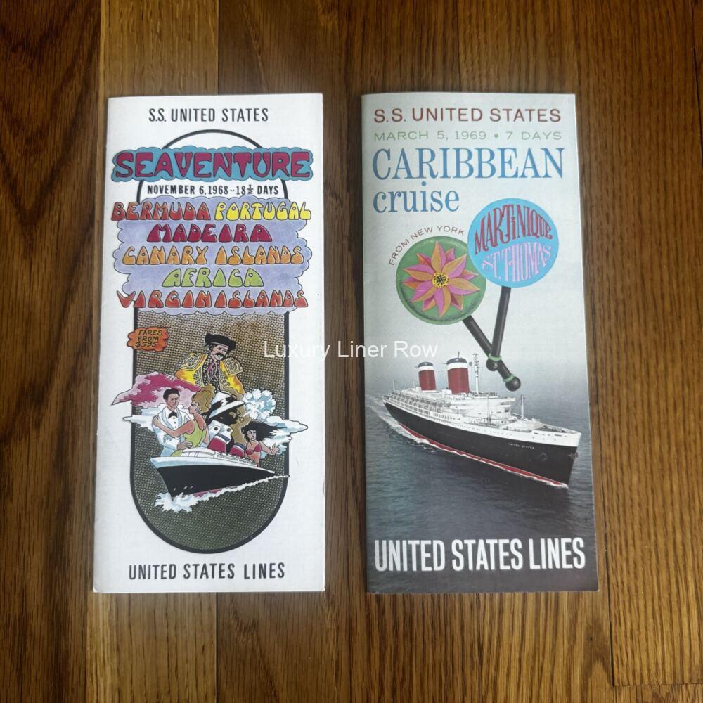 Want to take the November, 1968, or March, 1969, cruise on the ss United States? Of course, you do! Who wouldn’t!? Fares and color images inside and in near mint condition. JF.