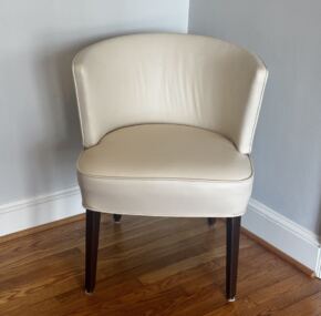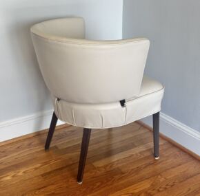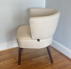 An amazing chair from a first-class suite on board the world’s fastest liner, the ss United States. Unholstered in an off-white leather, this chair is fully marked on the bottom with its original location on board. This comes from the suite on the opposite side of the ship from the famous Duck Suite. In great condition and ready to take pride of place in your Big U collection. As a well-known memorabilia dealer used to say: “rare as hen’s teeth.” Furniture from any suite on board the ssUS is certainly that! Not sure if it has been reupholstered, but if it has, it was extremely well done.