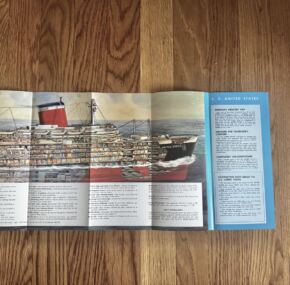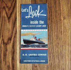 A look inside the world’s fastest liner! Photos of life and luxury on board plus opens to a full-color cutaway. Quite nice and in great condition. Once you get yours, you will see why these are extremely popular with United States Lines fans and ocean liner collectors! JF