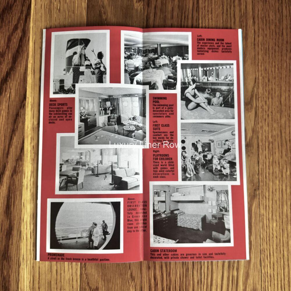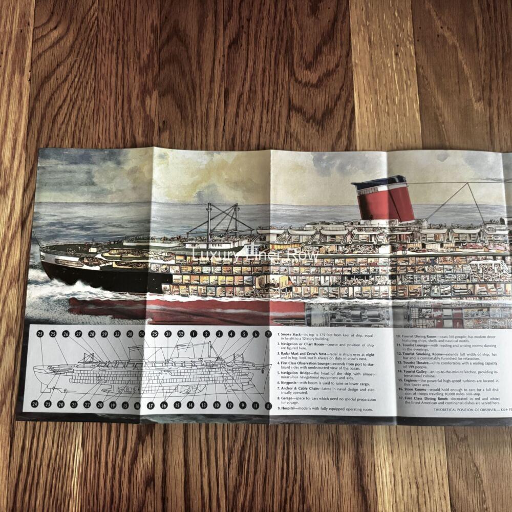 A look inside the world’s fastest liner! Photos of life and luxury on board plus opens to a full-color cutaway. Quite nice and in great condition. Once you get yours, you will see why these are extremely popular with United States Lines fans and ocean liner collectors! JF