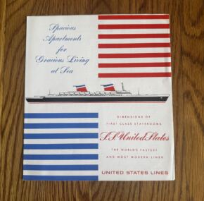 An interesting pamphlet of dimensions for all the first-class staterooms on board the ss United States. This is the USL showing off and being proud of their new flagship. I am certain this was found very useful by travel agents in the 1950’s to expound about the spaciousness of these large new cabins. Excellent condition. The info is just as interesting today as it was then! MC