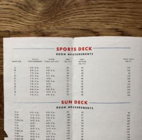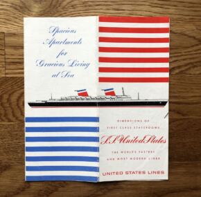 An interesting pamphlet of dimensions for all the first-class staterooms on board the ss United States. This is the USL showing off and being proud of their new flagship. I am certain this was found very useful by travel agents in the 1950’s to expound about the spaciousness of these large new cabins. In good condition with one chip to the cover. The info is just as interesting today as it was then!