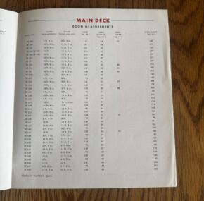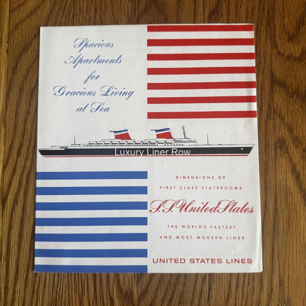 An interesting pamphlet of dimensions for all the first-class staterooms on board the ss United States. This is the USL showing off and being proud of their new flagship. I am certain this was found very useful by travel agents in the 1950’s to expound about the spaciousness of these large new cabins. Excellent condition. The info is just as interesting today as it was then! MC