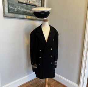 Uniforms very rarely come onto the open market, and here we have a beauty. Engineer officer’s coat and hat from the United States Lines, maybe from the Big U herself. The hat size is 7 7/8. Jacket has no size listed. Great condition. MO