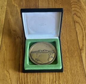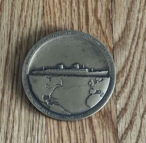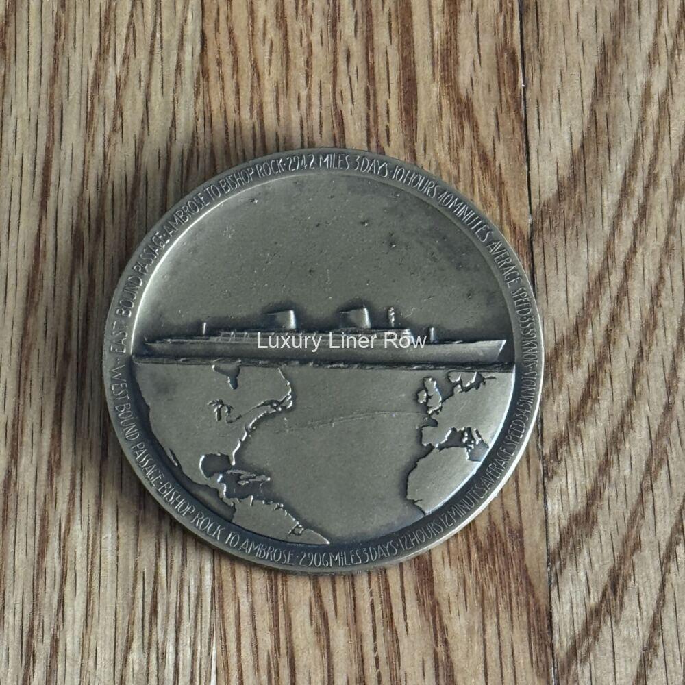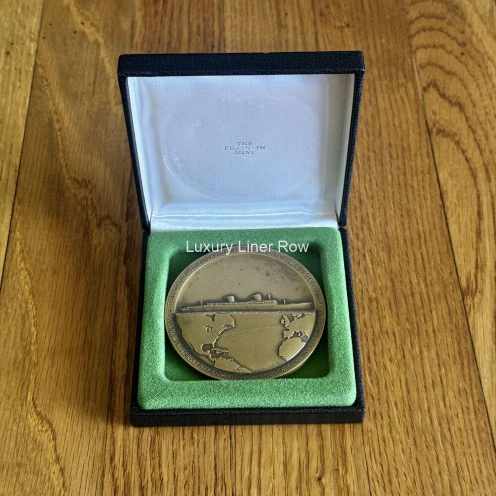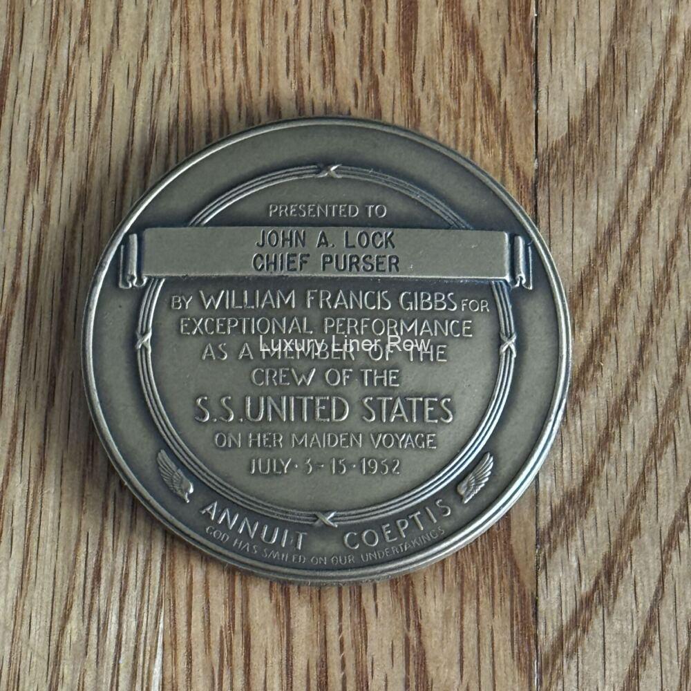 WOW! Here is something you don’t see often! In fact, this is the first one I have ever had the pleasure of offering. The famous bronze Gibbs medal made for each crew member who took part in that important record-breaking maiden voyage. This particular medal was given to John A. Lock, no less an important person than her Chief Purser. As you can imagine these are highly sought after, especially given how much attention the Big Ship has been getting lately. They also are not often sold out of the family that originally owned them for obvious reasons. Made, I gather, at Gibbs’s own expense, it really showcases how much he thought of the USL flagship and how important her record-breaking maiden voyage was. Of course, the ss United States was the highlight of Gibbs’s glittering career, designing all manner of ships. Not bad for a self-taught fellow! Around the edge, the medal lists both voyages with all the pertinent details from each direction. Made by the Medallic Art Company of New York. Comes with a box, but the box is not original. In excellent condition. AC