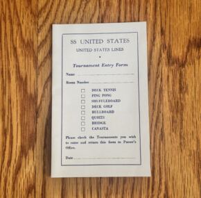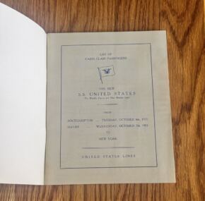 Lovely cabin-class passenger list for the October 6, 1953, voyage of the ss United States from Southampton to New York. Lots and lots of information about on-board services. Also comes with an entry form for the various tournaments on board like suhffleboard and deck golf. Nice condition. JF