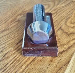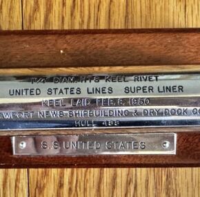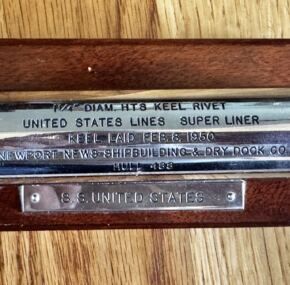 The Big Ship had big rivets! Exceedingly rare rivet from the keel-laying ceremony of the ss United States February 8, 1950. This is an impressive original gift for VIPs who attended the keel laying of the flagship of the United States Lines. Details engraved on the rivet. The entire display, including base, measures about 6″ long 2.5″ wide and 2.5″ tall. This is a king-maker piece for any ocean liner or ss United States collection. AC