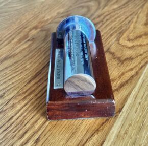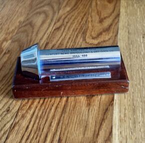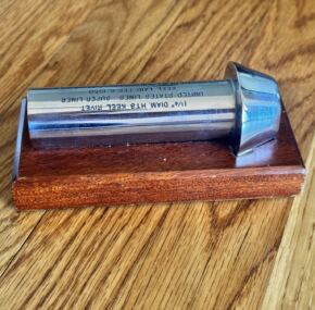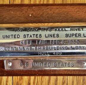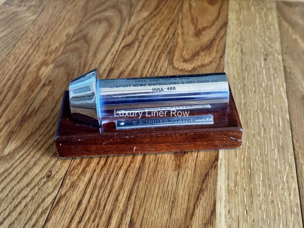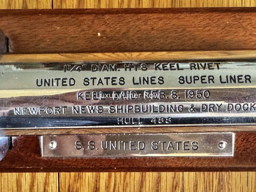 The Big Ship had big rivets! Exceedingly rare rivet from the keel-laying ceremony of the ss United States February 8, 1950. This is an impressive original gift for VIPs who attended the keel laying of the flagship of the United States Lines. Details engraved on the rivet. The entire display, including base, measures about 6″ long 2.5″ wide and 2.5″ tall. This is a king-maker piece for any ocean liner or ss United States collection. AC