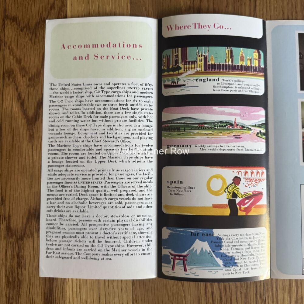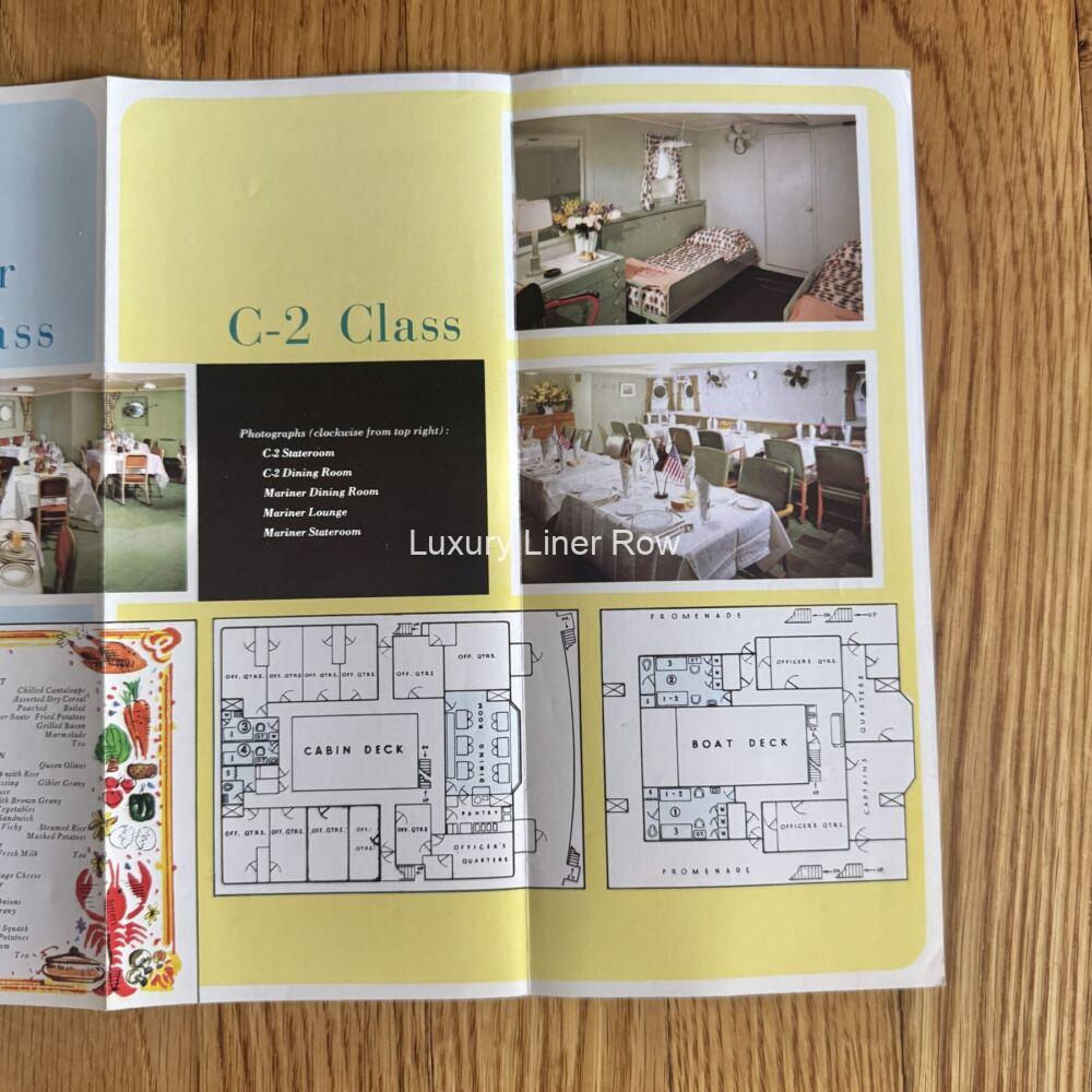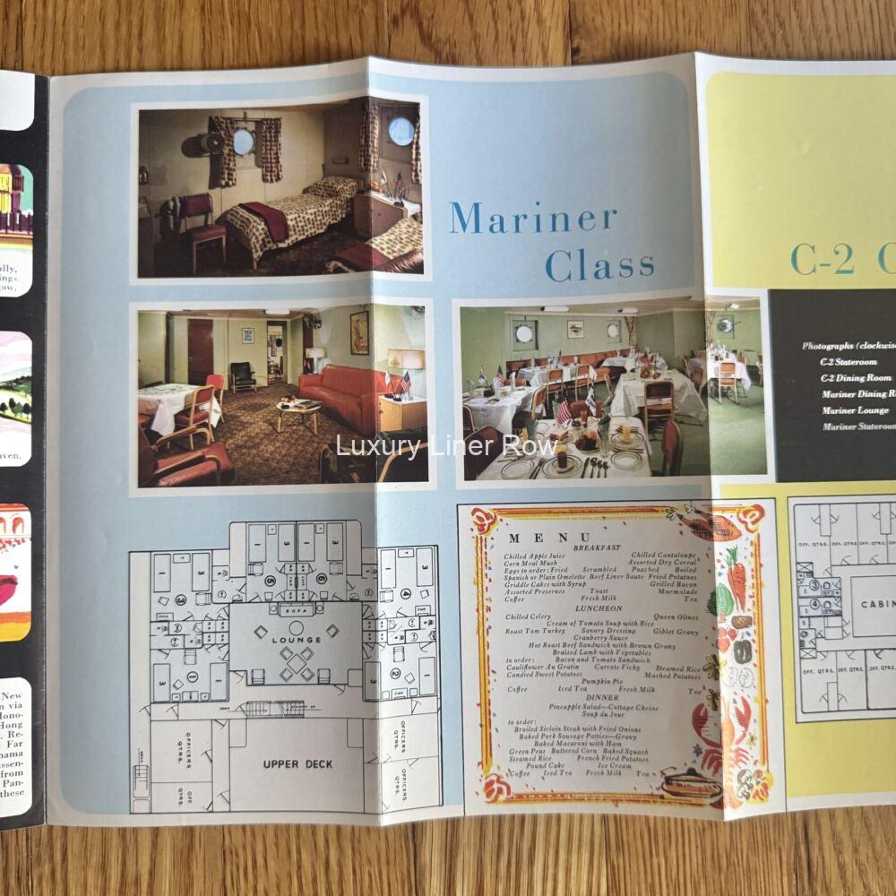 “Popular trips on cargo ships.” Fold-out brochure for the cargo/passenger services of the United States Lines. Has deck plans for each class of ship and full general information, including the cost to ship a car. The C-2 ships had a dining room that doubled as a lounge and only four cabins, two of which were singles for males only. The Mariner ships were slightly nicer and had a lounge and a dining room. Dates to post-1964 but pre-1969. I understand that passengers being carried on cargo ships is now a declining trend. Excellent condition. JF