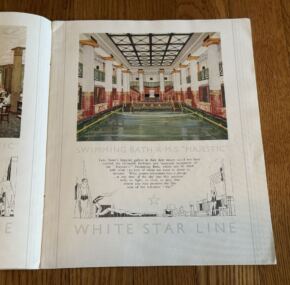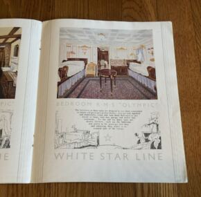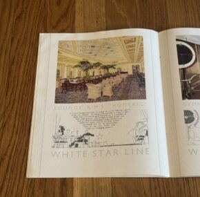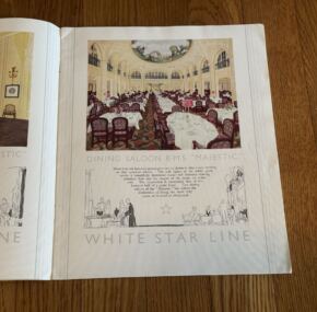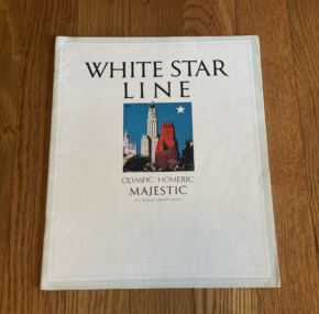 The famous Big 3! The world’s largest liner RMS Majestic paired with the famous RMS Olympic and followed up by the RMS Homeric. One of the must-have brochures for any serious White Star Line collector. It is likely the finest brochure ever done for White Star Line’s post-war trio of ships. 20 pages of full color covering all 3 ships. RMS Majestic as the flagship and largest ship in the world is, however, given slightly lower billing inside with the fantastic RMS Olympic getting the full-color double-page center spread. This one is in near mint condition with just the slightest of foxing on the cover that is hardly worth mentioning for something that is about 100 years old. JF