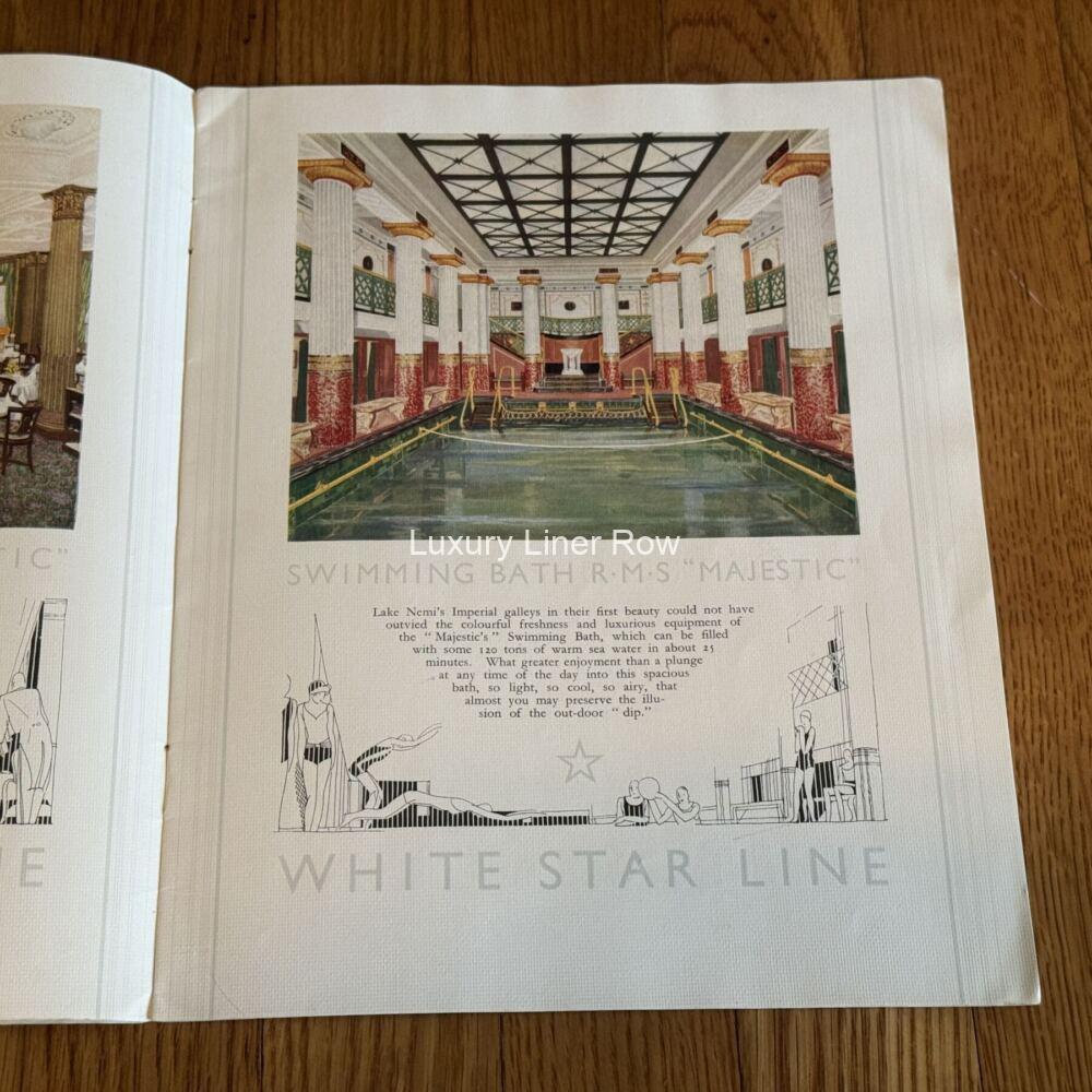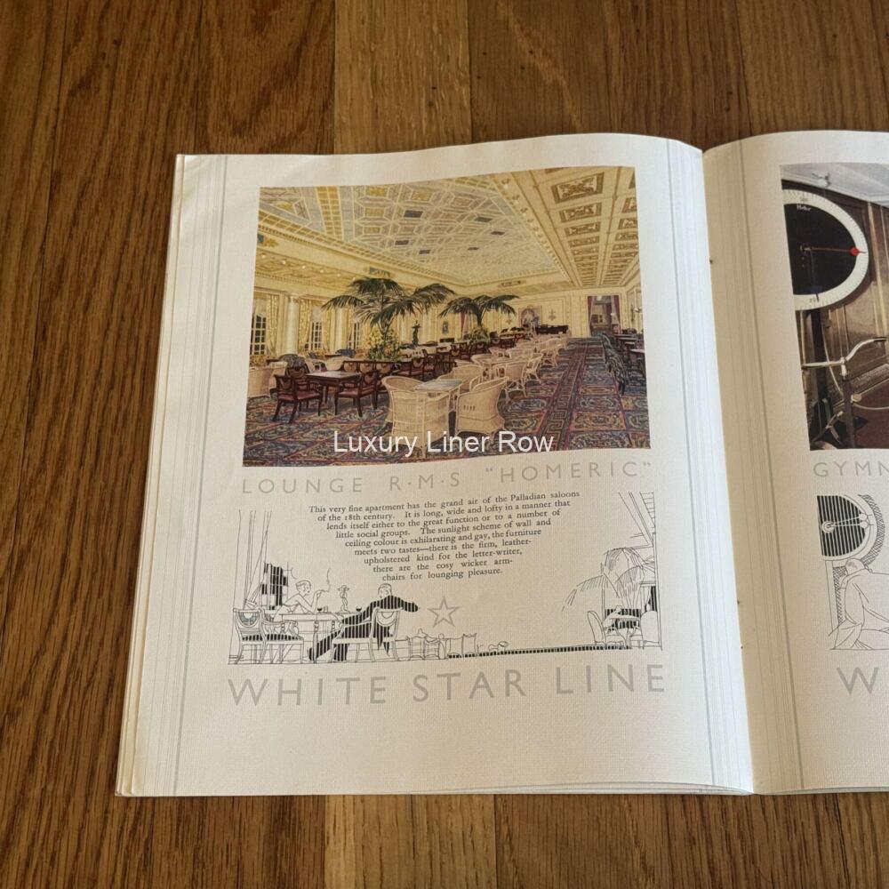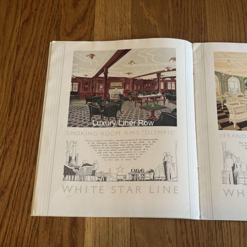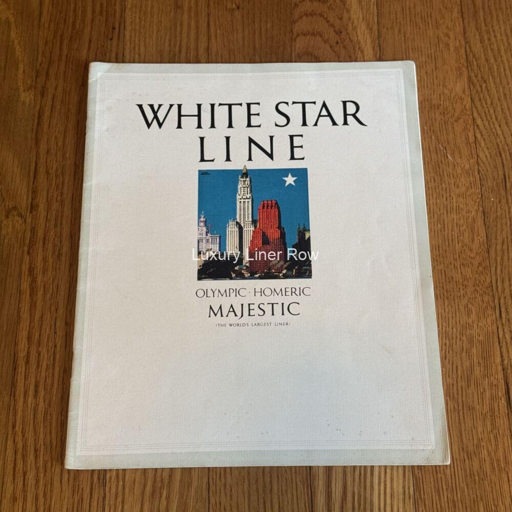 The famous Big 3! The world’s largest liner RMS Majestic paired with the famous RMS Olympic and followed up by the RMS Homeric. One of the must-have brochures for any serious White Star Line collector. It is likely the finest brochure ever done for White Star Line’s post-war trio of ships. 20 pages of full color covering all 3 ships. RMS Majestic as the flagship and largest ship in the world is, however, given slightly lower billing inside with the fantastic RMS Olympic getting the full-color double-page center spread. This one is in near mint condition with just the slightest of foxing on the cover that is hardly worth mentioning for something that is about 100 years old. JF