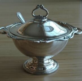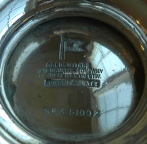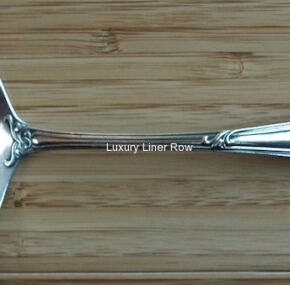 With most of Titanic’s silver on the sea floor and no other ship in the White Star fleet having used this pattern, we can safely say this piece was used on Olympic. It likely made its way down to us today via the Queen Mary or Queen Elizabeth. Cunard White Star, ever frugal and in the midst of the depression, transferred large amounts of silver and other useful items from Olympic and Majestic before they were scrapped. To this day, you can see quite a number of silver White Star items on display on board the QM. In fact, they have some nice examples of restaurant silver in their display. Luckily it still has its original ladle. As far as I know, there are only a couple of these left in the world. Measures about 10″ from handle to handle and stand about 7″ tall. It is in excellent condition with some loss of silver on the inside of the piece perhaps where the ladle rubbed the bottom. You can not see this when the cover is in place and the item is on display. Rare doesn’t describe it!