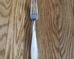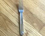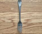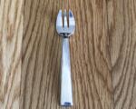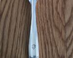 Unusually shaped silver fork from the famed ss Normandie. From her second-class service, this fork was made by Ercuis and is complete with hallmark. Measures about 5″ long.