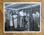 Unusual press photo of a passenger “tour” of the bridge of the ss Andrea Doria. Measures about 10″ x 8″.