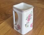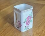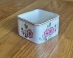 Cube-set rose-pattern creamer. Made by Grosvenor for Cunard. Bone china and in excellent condition with no chips, cracks, or crazing. Measures about 2” across by x 2¾” tall. JF