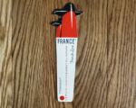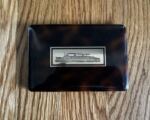 Souvenir pin tray from the French Line’s ss Normandie. Measures about 5″ in diameter. Originally sold by the ocean-liner dealer Ken Schultz as it still has his sticker on the back.